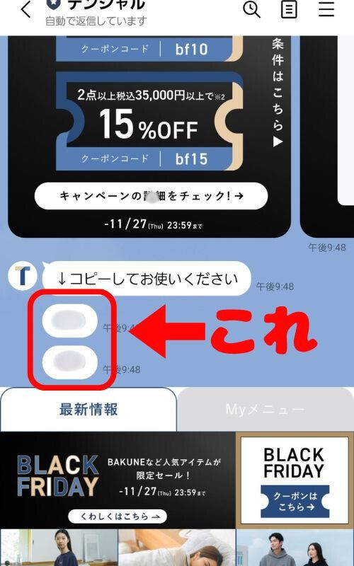 その後案内にしたがってLINE友だち登録を行い(2~3分で完了します)、トークメニューの『TENTIAL(テンシャル)』から再下段の『メニュー』を開き、最新情報にある『BLACK FRIDAY クーポンはこちら→』をタップします。